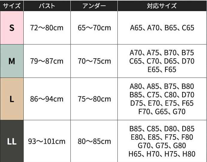 アップミースタイリングブラには複数のサイズがあり、S・M・L・LLサイズまで対応しています。